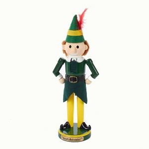 Celebrate the holidays with this 11" Wooden Buddy the Elf Nutcracker from Kurt Adler! Everyone's favorite human elf is featured here in his green tunic and hat, yellow tights, and pointed shoes. The plaque on his base reads, "Son of a Nutcracker."