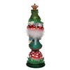 Hollywood Nutcrackers™ is a whimsical collection of nutcrackers created exclusively for Kurt S. Adler, Inc. and features an assortment of designs that put a unique, vibrant, memorable twist on traditional nutcrackers. This 16.5-inch unique piece is a fun, colorful new take on the Frog Prince. Wearing shades of red, blue, and tan this glittery, quirky piece is standing on a glittered mushroom base and holds a bird topped staff and is topped with a mushroom hat with a frog prince, complete with a regal gold crown.