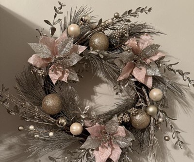 Kurt Adler 20-Inch Champagne and Gold Wreath with Pink Poinsettias and Ornaments