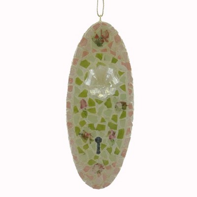 Step into a world of charm with the Mosaic Door resin ornament by Kurt S. Adler. This 5-inch oval-shaped piece brings vintage Victorian vibes with its intricate mosaic tile design, complete with a clear acrylic doorknob and rich orange and green tiles. Whether you're dressing up your holiday tree or adding flair to a year-round display, this unique ornament is a conversation starter. Its blend of color and old-world style makes it a delightful addition to any collection. Measures Approximately 5 In H X 2 In W X 1 In D (HxWxD). Includes 1 Resin Ornament.