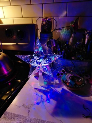 received this beautiful multi colored tree topper for my 6 foot new tree. wanted a star tree topper that wasn't so heavy and super big. so happy 😊 with it. received faster then expected and such a beautiful star. no issues and we love it so much! such pretty color and design. it ultimates just so perfectly with soft colors and sparkles amazlly! received compliments on it as well. very unique design stands out from the rest. so glad I chose that one from the whole rest that I was reviewing until this one caught my eye. prettier in person and it comes already with a plug / cord to plug into anywhere nearby or you can plug into an extension cord. I didn't have to had a power strip for my TV that's mounted on my wall so cord is long enough to reach pretty far. such a pretty ultimating tree topper and so glad that I am happy with my purchase. money well spent. :) will enjoy it hopefully for year's to come! :) I will repost once I am finished with everything and my tree topper is on top of the tree :)
