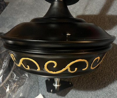 I ordered and paid for the higher priced fan because I didn’t like the gold designs on the lower priced fan but was sent the cheaper one with the gold designs. A close up of the designs is shown in the picture below. I had someone here to help me install it but when we got it out of the box and found out it wasn’t the one I paid for I was was disappointed to have my room torn up and now need to decide whether to box it up and return the cheaper one at the nearest Target, 30 miles away and wait for them to send the right one or settle for the cheaper one even though I paid for the better one.
