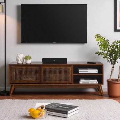 - The rattan-trimmed cabinet doors complement the natural countertop, creating a modern yet bohemian style in this TV stand with added storage. Ideal for adding storage space in your bedroom, living room, or entryway.
