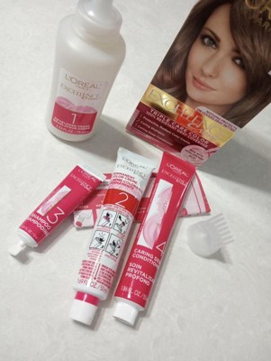[This review was collected as part of a promotion.] Excellence hair color came in a sturdy box which included everything needed for hair color. The instructions were specific and clear and easy to follow. Once I made the hair dye, the application was easy as the cream was thick and held well in the hair. It did not irritate my scalp and had I not put the timer on, I could have forgotten to wash it in time. I left it for half an hour to develop and it gave my natural dark brown hair an ash color quite effectively. All in all a good experience. A before and after pic is attached to show the difference