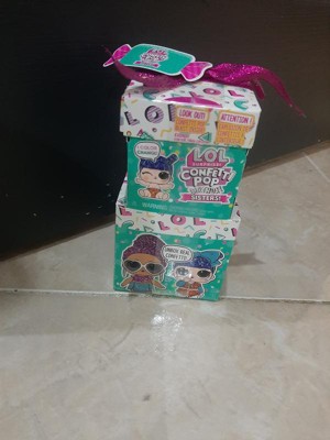- 10 SURPRISES: (1) L.O.L. Surprise! Confetti Pop Birthday™ doll; (2) Outfit; (3) Shoes; (4) Bottle; (5) Accessory; (6) Lil Sister; (7) Shoes; (8) Accessory; (9) Confetti Surprise Unboxing; (10) Lil Sister Color Change Surprise