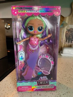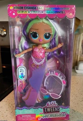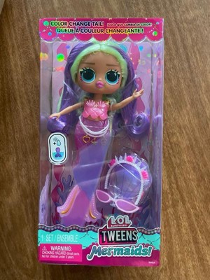 Get ready to dive into an enchanting world of magical mermaid fun with the all-new L.O.L. Surprise Tweens Mermaid Cleo Clove fashion doll with dazzling accessories to unbox! Perfect for bath time and imaginative play, Cleo Clove brings a splash of excitement with her beautiful color-changing tail and mesmerizing fin that can move back and forth! Dip your Tweens Mermaid doll into cold water and watch as her tail transforms colors from magenta to deep purple, creating a magical underwater experience! Can you guess what her light pink fin changes colors to? Don’t forget to style your doll with her charming accessories including her sea shades, sea shell tiara, and cute pearl belt! She has stunning features, gorgeous hair, her own fashionable mermaid look, and comes articulated for tons of posing opportunities, including sitting as she bends at her waist! She can even stand on her fin, making styling your doll even easier with greater stability! Discover what’s inside each box including a fabulous L.O.L. Surprise Tweens Mermaid doll, glasses, a headband, and a belt to complement the doll’s tail! Collect all 4 glamorous L.O.L. Surprise Tweens Mermaid fashion dolls: Cleo Clove, Lola Waves, Lana Marine, and Serena Finn for a complete set of endless mermaid fun!