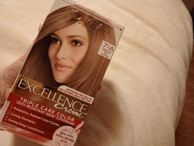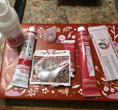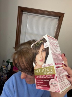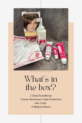 [This review was collected as part of a promotion.] I’m attaching a photo of what’s inside the box so you can see the full kit, plus two before-and-after shots: one of my overall hair profile to show the color transformation, and a close-up of my roots to highlight the gray coverage. The processing time was just 30 minutes for my all-over color, which was perfect for a busy evening. I always read the insert instructions carefully, wore the provided gloves, and used the after-care products as directed. Excellence Creme Permanent Triple Protection Hair Color - 5 Medium Brown I’ve been coloring my hair at home for years and most recently to cover those stubborn grays. Today, I tried L’Oreal Paris Excellence Creme in 5 Medium Brown. Overall, I’m really impressed with how this permanent hair color turned out, it’s rich, natural looking, and left my hair feeling healthier than expected. Let me break it down based on my experience. Mixing: The mixing process was straightforward. The kit comes with everything you need: the color creme and developer. I just poured them into the applicator bottle, shook it up, and it was ready to go. No lumps or weird smells, just a smooth, creamy consistency that didn’t drip at all. Ease of Use: This was one of the easiest at home colors I’ve used. I went for an all over application on my medium length hair, and the comb applicator attachment was what I screwed on to my bottle which was easy to swap out. It made it so simple to target my roots and ensure even distribution right where I needed it for those grays. No mess on my bathroom counter, and the non-drip formula meant I could move around without worrying about stains everywhere. Coverage: Speaking of grays, this provided 100% coverage, even on my resistant ones around the temples. My starting color was a faded dark to medium brown, and after checking the shade guide on the box, this matched perfectly. The result was a uniform, vibrant medium brown that looked salon fresh. Color can vary based on your base, so definitely double check the before and after photos they provide. Staining: I was careful to wipe away the color cream around my hairline and neck and shoulders immediately after application with a moist paper towel, and I’m glad I did because it does have some staining potential on skin. But it wasn’t too bad, no spots right after. No issues on my clothes or towels. Rinsing: Rinsing was quick and thorough. I followed the instructions to rinse until the water ran clear, which took about 5-7 minutes under cool water. No lingering residue, and my hair didn’t feel stripped at all afterward. Conditioning: The Triple Care routine with Hyaluronic Acid really shines here. The included shampoo and conditioner portions are generous. I have enough for two washes post-color and plenty of conditioner for more than a week! My hair feels soft, hydrated, and shiny right away, not dry or damaged like with some other box dyes. If you’re tired of stubborn grays and faded color that leaves your hair dry and damaged, L’Oreal Paris Excellence Creme Permanent Hair Color in Medium Brown is your game changer delivering 100% gray coverage, rich vibrancy, and hyaluronic acid infused conditioning in just 30 minutes for salon quality results at home.