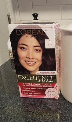 [This review was collected as part of a promotion.] I love this Loreal Excellence creme permanent hair color in shade black. It was easy to mix, comes with shampoo and conditioner and is made with hyaluronic acid. It is affordable and does great with covering my grays.