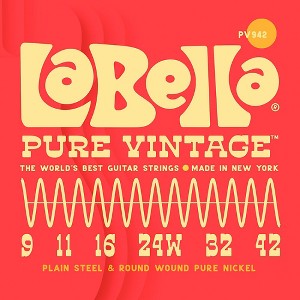 The La Bella Pure Vintage electric guitar strings deliver the authentic tone of the 1950s and '60s to instrument. Made from pure nickel and precision-wound in the USA, these light gauge strings produce a warm, balanced tone with rich overtones that defined the early days of rock and roll. 'll capture the legendary sound of favorite vintage guitars as these strings break in and mellow with age. Built to vintage specs, the Pure Vintage set comes in gauges of .009, .011, .016, .024, .032 and .042. Whether play a Tele, Strat or ES-335, these strings help channel Hendrix, Clapton and Page. For any guitarist chasing that iconic vintage tone, the La Bella Pure Vintage electric guitar strings are a vital part of setup.