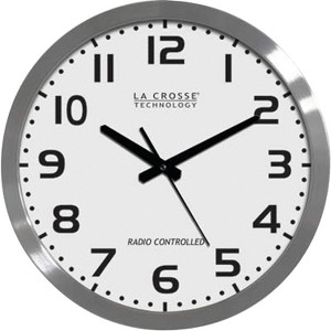 Create an appealing focal point in any room with the LaCrosse 16 in. Brushed-Metal Atomic Wall Clock. It has a classy 2 in. deep-brushed aluminum frame. Its features include a white dial, large black Arabic numerals, metal hands and it displays the atomic time. The atomic time works based on your desired time zone selection. It automatically sets for Daylight Saving Time and requires a AA battery.