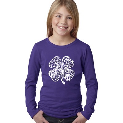 LA Pop Art Girl's Word Art Long Sleeve - St. Patrick's Day Shamrock Purple X Large