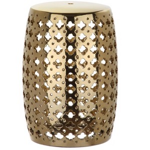 Add a touch of elegance to your space with the Lacey Garden Stool plated gold. Crafted from glazed ceramic, its golden hue reflects a sense of modern sophistication. This versatile piece can be used both indoors and outdoors, serving as a stylish side table or a chic accent for your garden. Its intricate design adds a layer of texture and interest to any setting. Perfect for those who appreciate a blend of functionality and art in their decor. Transform your home into a space that exudes both warmth and sophistication with this stunning garden stool. Enhance your decor and make a statement with this exquisite piece that goes beyond ordinary furniture.