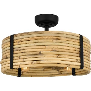 As part of the Quoizel Naturals series, the Lachlan ceiling fan light exemplifies modern bohemian style with a textured rattan shade. A matte black finish completes the look, adding a cool contrast to the natural shade. With a reversible three-speed motor and remote control, Lachlan is the perfect complement to any small interior space.