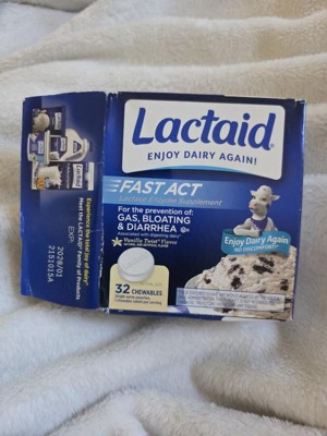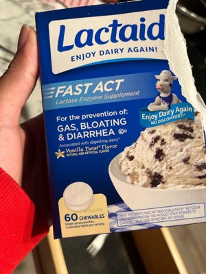 - Fast-Acting Relief: Lactaid Fast Act Chewable Tablets are designed to provide quick relief from lactose intolerance symptoms, such as bloating, gas, and diarrhea. The lactase enzyme helps break down the lactose in dairy, making it easier for your body to digest. Whether you're having a glass of milk or a slice of pizza, these chewables quickly work to prevent discomfort, allowing you to enjoy dairy without worry.