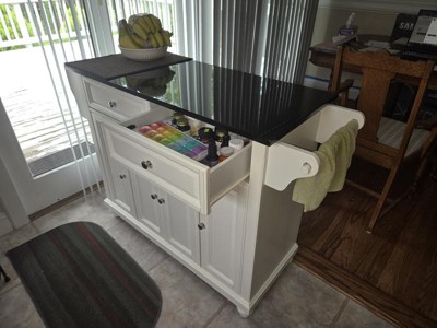The Lafayette Full-Size Kitchen Island adds enduring style and storage to your kitchen. Featuring three cabinets, each with an adjustable shelf, this island can easily store pots, pans, and small appliances. Two large drawers keep small items like utensils and dishtowels close at hand, while the built-in spice rack and paper towel holder keep your counter space free of clutter. With a beautiful granite countertop and sculpted feet, the Lafayette Full-Size Kitchen Island is a welcome addition to your kitchen space.