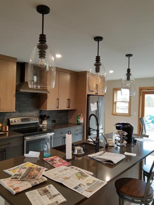 From the moment I saw this fixture in a lighting store I knew it was the fixture i wanted for over the kitchen sink, I like how the spindles look with the coiled faucet, I was told it could not be mounted semi flush but my contractor said otherwise! It’s big and beautiful, definitely a statement piece!