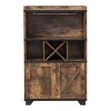 The brown wine rack features a distinguished wood Farmhouse design with contrasted nailhead trim, plank cabinets and rugged X wine rack. Store stemware glasses with ease thanks to the built-in hanging rack and store spirits, extra glasses, bar tool and more with the open shelves and double door cabinet below.