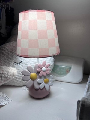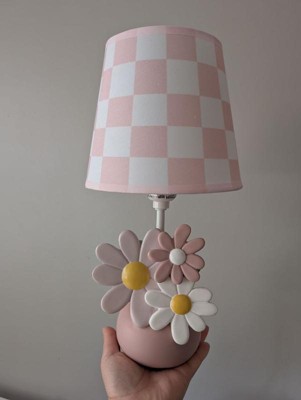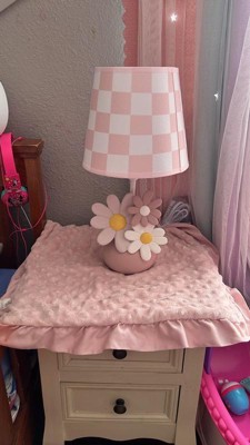 Add a soft glow to your child’s room with this Daisy Dreams hand-painted 3-dimensional resin lamp with shade and LED light bulb. An adorable rose pink flower pot is filled with one white daisy, one petal pink daisy, and one rose pink daisy along with two green leaves. The total height of the lamp with shade is approximately 14”. The coordinating lamp shade is a pretty petal pink and white checkered pattern. Comes complete with an energy efficient LED light bulb.