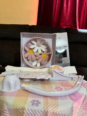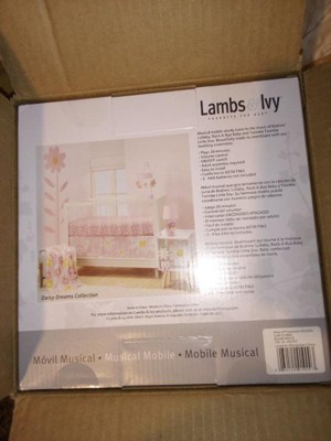 Four soft velour daisies rotate slowly around this charming Daisy Dreams musical mobile. Two daisies are rose pink with sun-kissed yellow centers and two are soft white with rose pink centers. The decorative ring is a rose pink ground with seven white daisies embroidered all around. A white velour scrunchie covers the mobile arm. This musical mobile plays nursery songs for 20 minutes, has an on/off switch, and volume control. It plays Brahms Lullaby, Twinkle, Twinkle Little Star, and Rock-a-By-Baby. Requires 3 AAA batteries, not included.