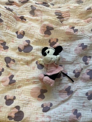 Wrap your little one in total comfort with this breathable 100% cotton muslin swaddle blanket. It features Minnie Mouse along with moons and shooting stars. This set also includes a cute little Minnie Mouse plush. Minnie is wearing one of her favorite pink velour dresses, shoes, and bow. She is approximately 4 ½” tall and her face is embroidered making her baby safe. This set makes a great baby shower gift or welcome home baby gift.