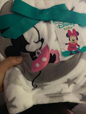 This super soft luxury coral fleece blanket features Minnie Mouse napping on a gray crescent moon. The body of the blanket is a soft white with multi-colored gray stars. It measures 30” x 40” and is the perfect size to cuddle your little one. It makes a great baby shower gift.