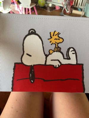 - Features Snoopy on his doghouse with Woodstock comfortably sitting on his tummy