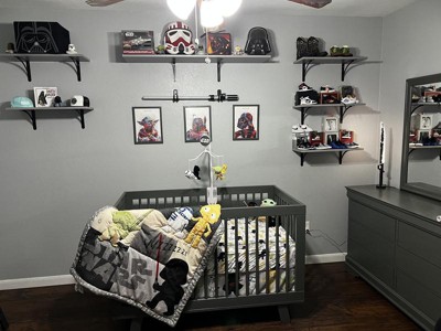 [This review was collected as part of a promotion.] If you are a Star Wars fan this is perfect for your little one. The 3-piece set is perfect. The fitted sheet is nice and soft for the baby's skin. I really like that even after a few washes the colors are still nice and vibrant. Also, the sheet fits nicely over mattresses and doesn't shrink either when washing. The quilt is perfect to use while cuddling with your little one, and then once they are able to sleep in a toddler bed this is a perfect cover for them. I especially love that the theme of Star Wars was even added to the crib skirt. Lamb & Ivy really make nice quality products to help decorate baby rooms.