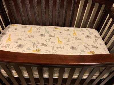 This jungle inspired 100% cotton jersey fitted crib sheet features some of our favorite jungle animals. Included are giraffes, elephants, tigers, zebras, lions, monkeys and sloths on a soft white ground. It has elastic all the way around ensuring a safe and secure fit on a standard sized crib mattress measuring 52” X 28”.