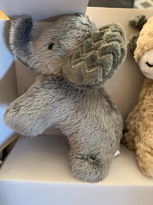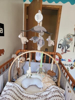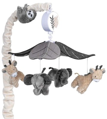 Two taupe minky giraffes with an eyelash trim and two gray elephants with embroidered ears rotate under a canopy of embroidered leaves. Add to that a friendly furry sloth with hook and loop material that attaches to the cream colored scrunchie which covers the mobile arm. The musical mobile rotates to nursery songs for 20 minutes, has an on/off switch and volume control. It plays Brahms Lullaby, Twinkle Twinkle Little Star and Rock-A-Bye-Baby. Requires 3 AAA batteries not included.