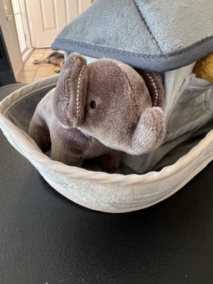 This unique Noah’s Ark is an oval shape made in a beige velour with charcoal embroidery lines. A four inch handle on top allows for easy carrying. There is a 2” opening with a flap window on one side and a 2” opening on one of the short sides to give the animals a view of the outdoors. The ark is approximately 12” long X 7 ½” high X 7” wide. There are three plush animals to play with in and around the ark. A giraffe made with honey gold curly boucle with pearl grey embroidered spots. A taupe velour elephant with rainbow color stitches in his ears, and a majestic lion with a 3-dimensional mane and embroidered features. This interactive Noah’s Ark makes a great baby shower gift or welcome home baby gift.
