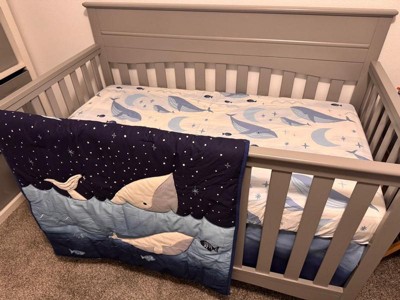This amazing crib bedding set includes one quilt, one breathable 100% cotton fitted crib sheet, and one crib skirt. The cotton blend quilt features an appliqued mommy whale swimming side by side with her baby. A sateen blue moon with starry skies and a beautiful transition of blue colors create a tranquil sleep space for your little one. The breathable 100% cotton fitted crib sheet has a repeated pattern of whales, fish, moons, stars, and waves in various shades of blue on a soft white ground. The fitted crib sheet has elastic all the way around ensuring a safe and secure fit on a standard size crib mattress measuring 28” X 52”. The crib skirt adds the finishing touch to your child’s crib. It beautifully blends light to deep blues and has a 14 ½” drop. It gracefully conceals the hardware underneath the crib, creating a clean, finished appearance for your nursery.