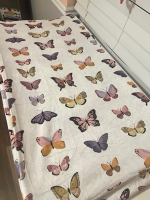 Transform your changing table into a haven of comfort and wonder with this Butterfly Dreams changing pad cover. This charming changing pad cover is made of ultra-soft minky with beautiful butterflies in pink, lavender, purple, orange, and gold. There is elastic on the two short sides ensuring a snug fit on a standard size changing pad. Buttonholes for the safety straps so your little one is safe and secure while getting their diaper changed.