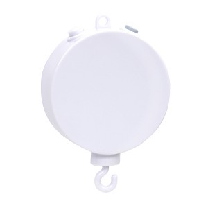 This battery-operated music box plays nursery songs for twenty minutes, has an on/off switch and volume control. The hook rotates to the educational music of Brahms Lullaby, Twinkle Twinkle Little Star and Rock A Bye Baby. Hole on top and hook on the bottom for easy attachment. Requires 3 AAA batteries not included.