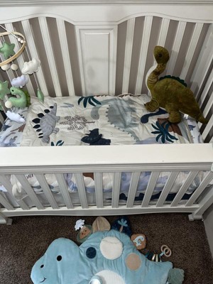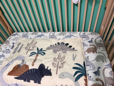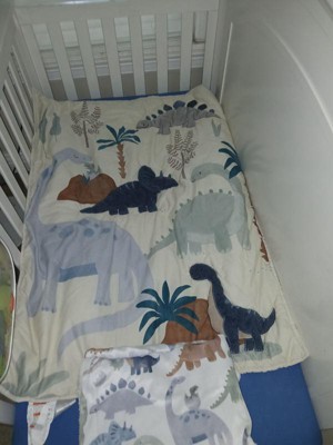 - 3 piece dinosaur crib bedding set includes one quilt, one 100% cotton fitted crib sheet, and one crib skirt