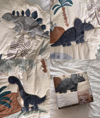 Your little one will drift off to dreamland with their favorite prehistoric creatures playing hide and seek among ancient trees and Jurassic rocks. This 3 piece dinosaur themed crib bedding set includes one quilt, one 100% cotton fitted crib sheet, and one crib skirt. The quilt is on a creamy white ground that is made of pure cotton twill. Several of the dinos are appliqued in gray and blue velour and soft textured boucle. The watercolor style printed fitted crib sheet features multi colored dinos and has elastic all the way around ensuring a safe and secure fit on a standard size crib mattress measuring approximately 52 inches by 28 inches. The crib skirt adds the finishing touch to your child’s room and features a long appliqued dino tail in blue boucle fabric.