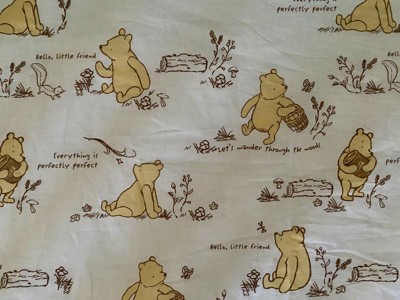 [This review was collected as part of a promotion.] This crib sheet is super cute, super soft, and 100% cotton! It fits a standard size crib mattress and is elastic lined. I found that it has deeper pockets than most and it did not shrink up after washing, which is what has occurred with other crib sheets I have used. It is white with Winnie the Pooh in various poses and has sayings like “Hello little friend', Let's wander through the woods” and “Everything is perfectly perfect”. It is perfectly perfect for a boy or a girl! My 2 year old loves it. I recommend if you are looking for an adorable high quality crib sheet!