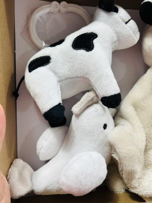 This set is so cute! The plush toys and the little blankey is super soft, made with great quality material. The plush cow is great for hanging on to babies' stroller and play mat. The colors really catch my baby's attention. This set makes a great gift too!
