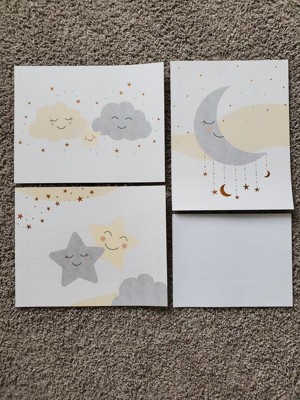 - One print features smiling clouds, one a gray crescent moon with smaller copper metallic stars and moons, and one with two smiling stars, a cloud, and a trail of metallic stars