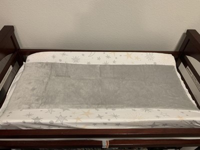 A soft luxurious, cozy gray minky center is perfect for changing your little one. The side panels are cotton featuring crescent moons and tossed stars. There are buttonholes for the changing pad straps so your little one is safe and secure while getting their diaper changed. There is elastic on the short sides in order to fit securely on a standard sized changing pad. It is machine washable for easy care.