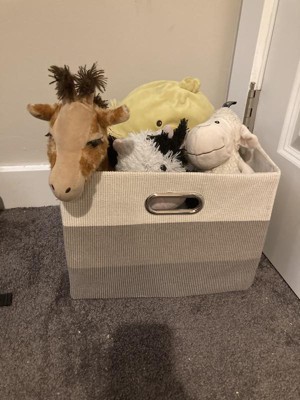 [This review was collected as part of a promotion.] I got this basket to store some stuffed animals in my kid’s room. It looks beautiful and matched the colors as well. It felt very strong and sturdy when I first opened it. After a few days, my toddler tripped into it while trying to get out his animals. The cardboards inside have since been completely bent. It is still usable but it doesn’t look the same. A few more bang ups and I don’t think it will still be around. It’s a shame because it really does look and feel nice.