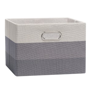 These sturdy ombre storage baskets are the perfect addition to your stylish nursery, playroom, kids’ room, and even your office. They are made in a cross-weave textured cotton, poly, rayon fabric with a poly cotton rayon lining. There are two built in silver metal handles for easy carrying. The baskets are 12 ½” X 11” X 9”. The color sequence is natural cream at the top, light gray in the middle and medium gray at the bottom. Spot clean only.
