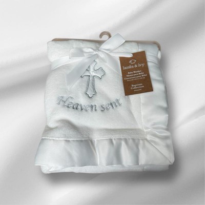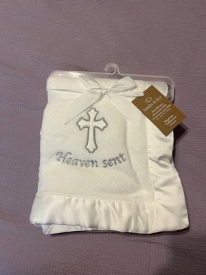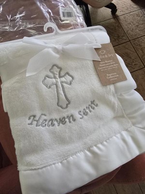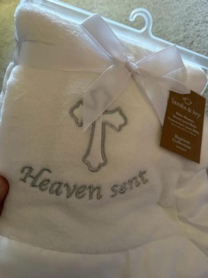 [This review was collected as part of a promotion.] Cute, simple baby blanket. It is a fleece blanket with the satin trim in white with “Heaven Sent” embroidered on it. Neutral so good for boy or girl and geared towards a baptism gift. It is 30 inches by 40 inches so it is a good sized for a baby blanket.