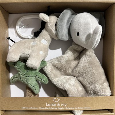 - Includes an elephant security blanket / lovey, an adorable giraffe stroller toy, and a cute palm tree mini plush toy with crinkle leaves