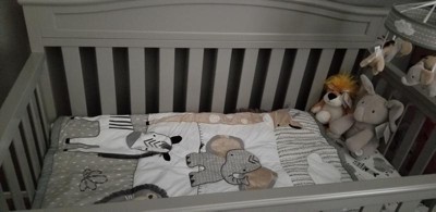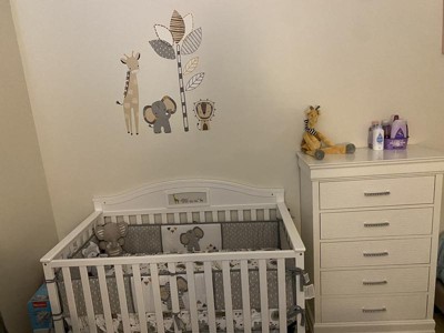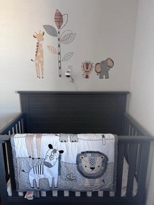 This six-piece crib bedding set includes one quilt, two cotton fitted crib sheets, one crib skirt, one wearable blanket (recommended for safe sleep), and a set of wall decals to complete your nursery decor. The neutral color palette makes it perfect for boys or girls. Babies, infants, and kids will love the safari animals including a lion, giraffe, elephant, and zebra. Dimensional trims along with soft furry fabrics and embroidered details add to this popular themed baby bedding set. The back of the quilt is 100% cotton. The 100% cotton, breathable fitted crib sheets include one tossed animal print and one solid gray. A dotted print with gray furry trim completes the decorative crib skirt. Included for safe sleep is a 100% cotton interlock wearable blanket with lion applique. Fits a size small - medium. Add a designer touch with these easy on easy off wall decals. Included is a happy giraffe, a sweet elephant, a courageous lion, and a colorful tree. Finish your jungle safari nursery theme with additional accessories sold separately, such as an extra fitted sheet, baby blanket, plush elephant stuffed animal - Jett, musical baby crib mobile, and additional wall decals.