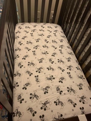Add some fun to your nursery with this Disney Baby Magical Mickey Mouse 100% cotton fitted crib sheet. It features Mickey Mouse in various positions along with multiple gray stars. The sheet has elastic all around providing a safe and secure fit on a standard sized crib mattress measuring 52” X 28”.