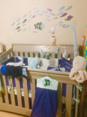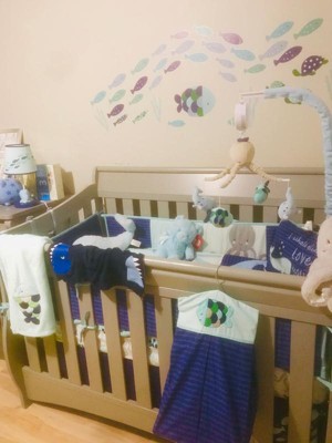 Started a nursery for my expected Pisces son and this is so awesome! Quality, color, detail, price, and free quick shipping. I brought EVERY piece in the Oceania set including the lamp, both pillows and wall decals; except the crib bumpers. (I’ll opt for mesh/sheer breathable liner bumper.) I love it, my family loves it too! I know my little swimmer will too!!!