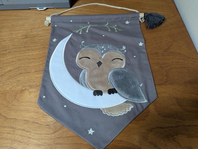 Decorate your child’s room with this charming canvas banner. It is 15” tall and 12” wide excluding the hanging rope. It features an appliqued owl sitting on a crescent moon on a dark gray canvas. The owl is made in a tan textured minky. His head and wings are made in a high pile gray minky, and his facial features and feet are embroidered in charcoal gray. The crescent moon is appliqued in a bright white velour in addition to white embroidered stars. There is a decorative dark gray 2” tassel, a rubber wood dowel, and cotton rope. Spot clean only.