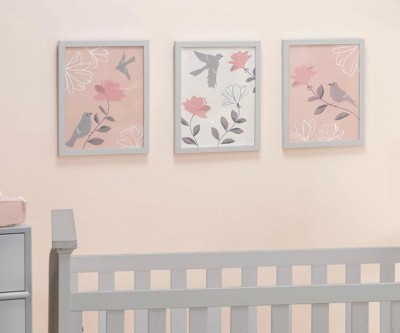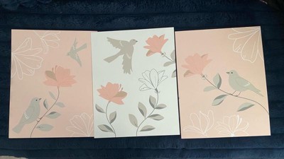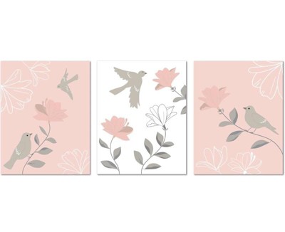 Lambs & Ivy Petals Pink/Gray/White Floral/Birds 11 by 14 Unframed Wall Art 3pc