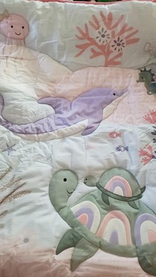 This three-piece under-sea ocean themed crib bedding set includes one quilt, one breathable 100% cotton fitted crib sheet, and one shirred crib skirt. Your child will be perfectly cozy in this luxurious aquatic habitat. An adorable 27” long dolphin is appliqued in a super soft lavender velour and her tummy is white ribbed velour. The mommy and baby turtles are appliqued in green ribbed velour with colorful rainbows. A cute jellyfish is a light pink minky with a pretty gold bow and six gentle embroidered tentacles. A darling little seahorse is appliqued in green velour with blue trim. The breathable 100% cotton fitted crib sheet is decorated with dolphins, sea turtles, jellyfish, sea horses, small fishes, and coral. There is elastic all the way around ensuring a safe and secure fit on a standard sized crib mattress measuring 28” X 52”. The crib skirt adds the finishing touch to your child’s crib. The shirred panel is a cotton twill blend in a light pink with a rose-colored bubble pattern which is shared with the back of the quilt. The bottom is a solid mint twill with pink pom pom trim in between. It has a 14 ½” drop and all items are machine washable for easy care.