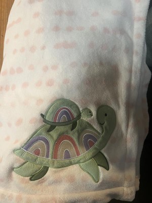 - Features mommy and baby sea turtles appliqued in soft minky with rainbows on their shells